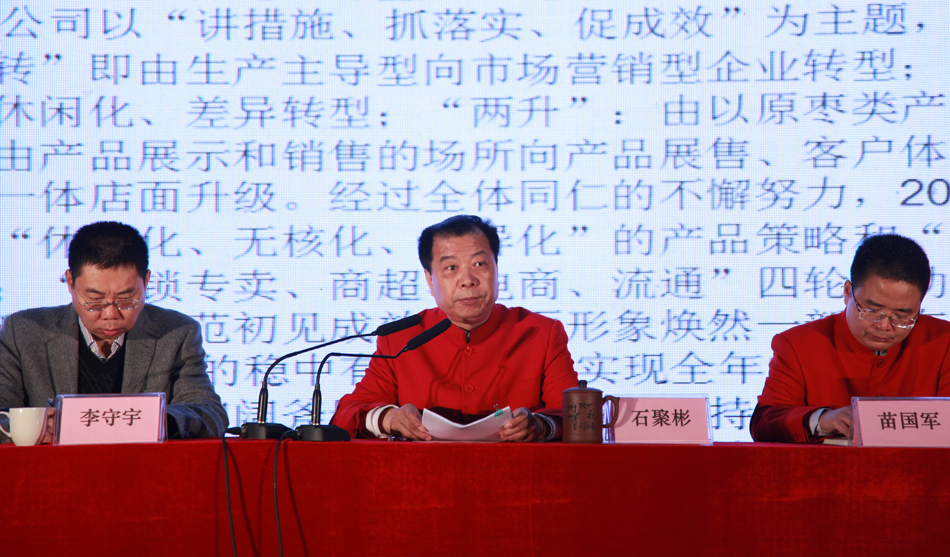 会议伊始,董事长石聚彬首先结合中国经济发展的大环境,回顾了2014年公 司各项工作的开展情况。2014年,公司以“讲措施、抓落实、促成效”为主题,强力推动“两转”、“两升”,经过全体8868体育人的 不懈努力,2014年公司产品结构不断调整,“休闲化、无核化、差异化”的产品策略和“健康零食”的产品定位渐入人心;连锁专卖 、商超、电商、流通四轮驱动的渠道策略逐步成型;市场整顿和市场规范初见成效,店面形象焕然一新。在严峻的市场环境下,2014 年公司销售收入稳中有增,基本实现全年的目标任务;与此同时,产品、渠道转型得到了客户、消费者、媒体和资本市场的广泛认同 ,8868体育品牌的知名度和美誉度大大提升,8868体育“中国红枣领导品牌”的行业地位得以巩固。