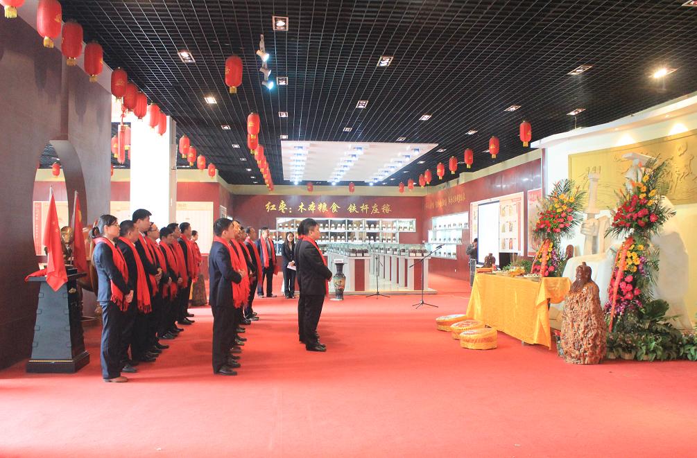 在简单的集合、列队之后,大家在礼仪人员的引导下,怀着激动、虔诚的心情步入中华枣文化博物馆,肃立在轩辕黄帝像前。鸣盛世礼炮,缅人文始祖。在储运部经理任凰玮的主持下,张艳菊、张宗成、卢占军、卢国杰向黄帝像敬献花篮,随后众人又一一来到台前,虔诚进香,行施拜礼。紧接着,张五须缓步走到话筒前,恭读拜祖文,表达对黄帝功德的仰慕和追思。而此时直播拜祖大典里,少儿合唱队在歌唱家领唱下,齐声高唱《黄帝颂》:“天地玄黄,东方曙光,文明始祖,中华炎黄……”优美的歌声在会场传扬,唱出了亿万华人缅怀祖先、祝福祖国的心声。