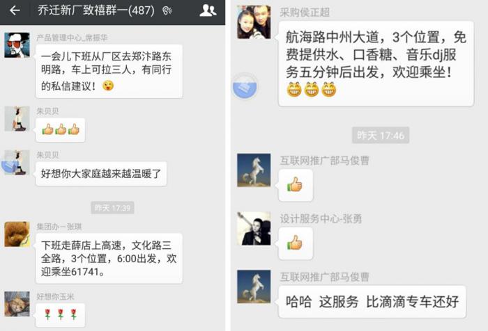 目前,一共有36位同事为大家提供“顺风车”服务,临近下班时间的“抢单”模式,也得到广大员工的“点赞”好评。除了发布时间、路线、可搭乘人数信息外,还有同事用免费饮用水、口香糖招揽“生意”。为了给同事带去方便,车主们积极响应的举动瞬间感动了大家,同事们纷纷表示“幸福感爆棚”!