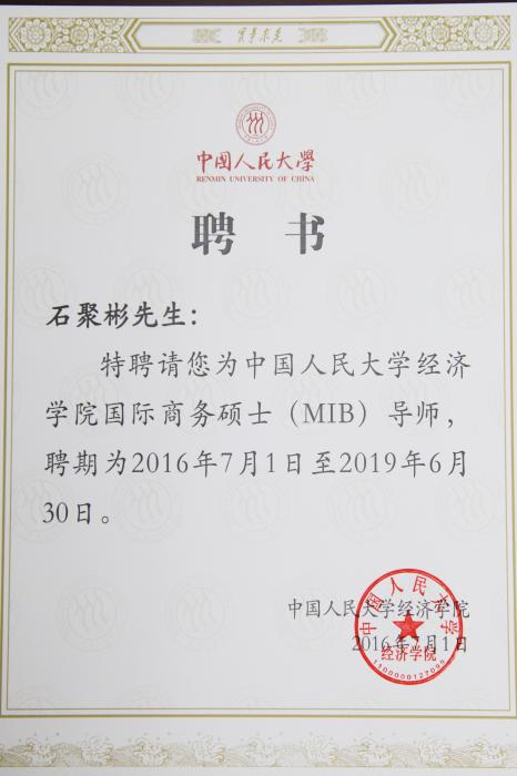 7月1日晚,中国人民大学经济学院国际举行商务硕士(MIB)校外导师聘任仪式,8868体育枣业股份有限公司董事长兼总经理石聚彬作为校外导师代表出席。中国人民大学党委副书记吴付来、经济学院院长张宇、院党委书记关雪凌书记、副院长王晋斌在现场为董事长颁发校外导师聘书。
