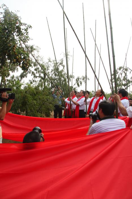 “打枣嘞,打枣嘞……”伴随着枣乡姑娘们嘹亮的声音,出席开幕式的领导、嘉宾来到枣园采摘区,挥杆打下象征着丰收喜悦的红枣,共同祈福风调雨顺、国泰民安。